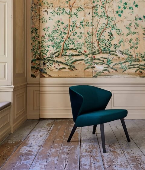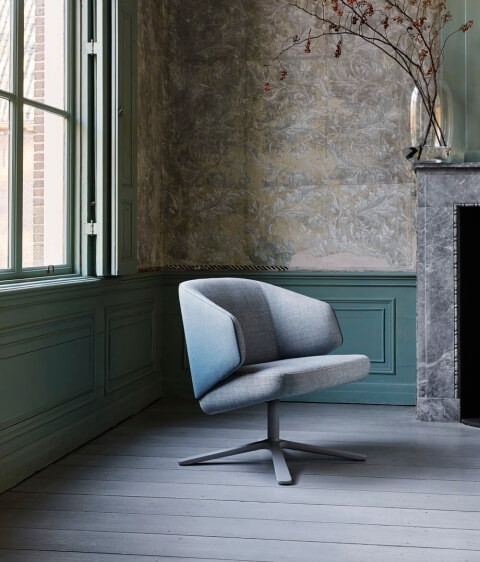 The Back Me Up family of chairs include three versions that can all function together, in any place. The Lounge version is characterised by its large, inviting armrests, while the Salon’s open arms bolster its modest character. As the base for the club chairs you can choose between an elegant swivel base and four wooden legs that spread graciously outward.