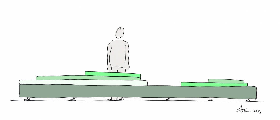 2003 - For Lensvelt, Brekveld developed a piece of furniture that can be custom-made to any desired length, accurate up to the centimeter. For the upholstery, the entire width of a roll of fabric is used, leaving almost no remaining fabric. The length of the design is limited only to the length of the roll of fabric. The cause for his design was a special piece of furniture for Galery 'Tent' designed by Brekveld in the year 2002 for the Rotterdam museum night: a 7 meters long matrass. The matrass was constructed on low legs, giving it a floating quality. The resulting image was the inspiration for designing a similar piece of furniture.